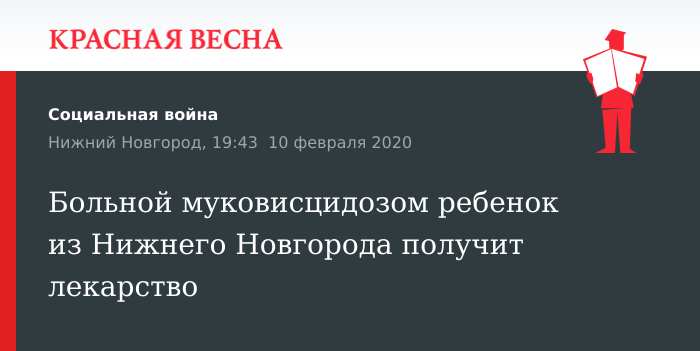 Лекарство для больного тяжелой формой муковисцидоза ребенка из Нижнего Новгорода получили, сообщили в Министерстве здравоохранения региона 10 февраля РИА Новости.