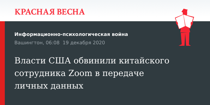 Обвинения в травле и передаче персональных данных предъявили власти США китайскому сотруднику американской компании Zoom Video Communications. Информация об этом 18 декабря опубликована на сайте Минюста США.