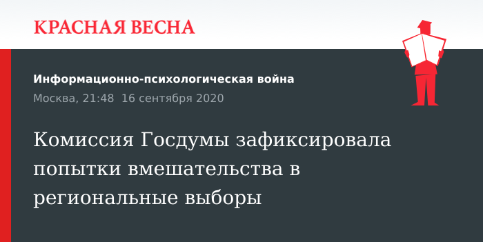 Попытки умышленного вмешательства в выборы 13 сентября зафиксировала комиссия Госдумы по расследованию фактов иностранного вмешательства во внутренние дела РФ, заявил глава комиссии, председатель комитета ГД по безопасности и противодействию коррупции Василий Пискарев 16 сентября журналистам.