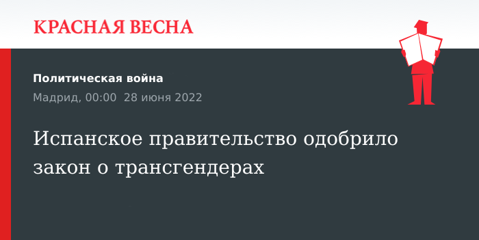 Закон о трансгендерах одобрило испанское правительство, передает 27 июня EFE.