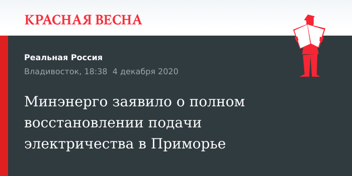 Отчет о восстановлении энергообеспечения для всех потребителей Приморья распространило Министерство энергетики России, 4 декабря сообщила пресс-служба ведомства.