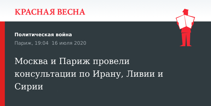 Ряд вопросов, связаных с региональным и мировым кризисом, в том числе с распространением коронавируса, обсудили представители России и Франции в ходе встречи в Париже, 16 июля сообщает пресс-служба французского МИД.