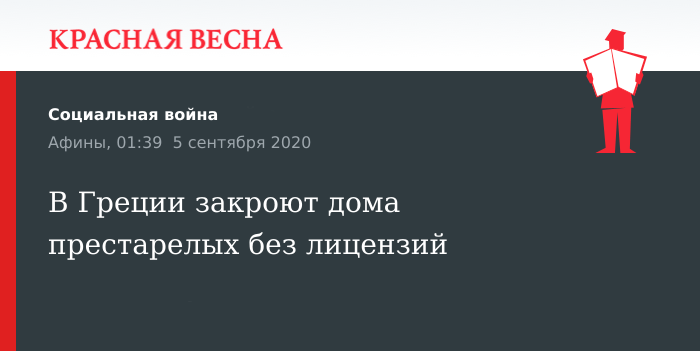 Отметим, в домах престарелых Греции отмечаются вспышки коронавируса. Сообщалось, что к 3 сентября из-за коронавируса скончалось 20 пожилых людей из дома престарелых Агия Кириаки в Асвестохори в результате заражения одного из работников учреждения от своего родственника, посетившего концерт в Халкидики. В доме престарелых Эстиа Папагеоргу скончалось 9 жителей.