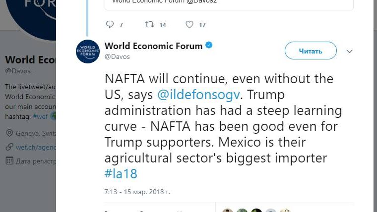 На странице Всемирного экономического форума в Twitter цитируется запись Ильдефонсо Гуахардо: «NAFTA продолжит свое существование даже без США». Также отмечается, что для президентской администрации Дональда Трампа Мексика является крупнейшим импортером сельскохозяйственного сектора США.