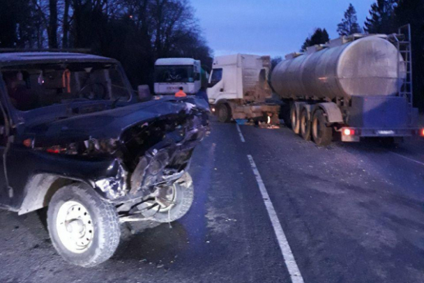 ДТП произошло в Кингисеппском районе в 05.05 по московскому времени. По данным ГИБДД, водитель автомобиля «УАЗ» наехал на пешехода вне зоны пешеходного перехода, прежде чем выехать на встречную полосу и столкнуться с грузовиком Renault Premium.