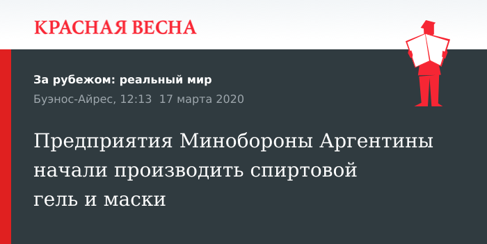 Предприятия, подчиняющиеся министерству обороны Аргентины, перешли на производство респираторных масок и спиртового геля для гражданских нужд, заявил 16 марта глава Минобороны страны Агустин Росси в интервью аргентинскому информагентству Télam.