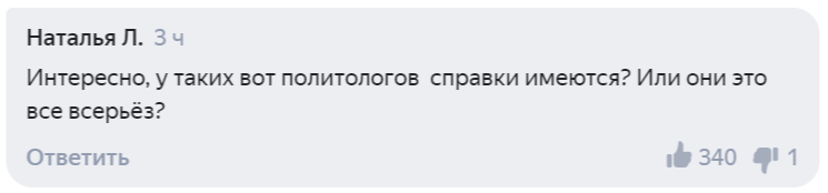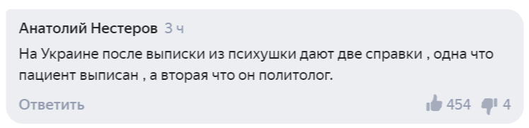 Пользователь Анатолий Нестеров с иронией написал о том, что украинский политолог обладает сразу двумя справками: одной — что лечился, и второй — что политолог.