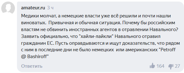Пользователи Сети прокомментировали слова официального представителя правительства Германии Штеффена Зайберта, который заявил, что российский оппозиционер Алексей Навальный нуждается в защите, «поскольку существует определенная вероятность отравления».