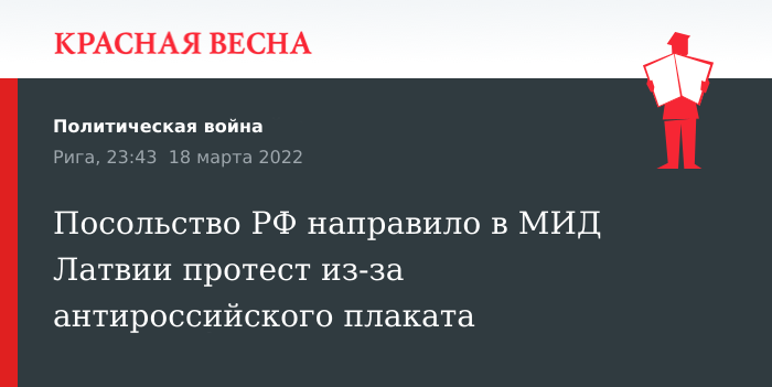 Министерство иностранных дел Латвии получило ноту протеста от посольства РФ в Риге из-за антироссийского плаката, размещенного стене Музея истории медицины им. Паула Страдыньша, заявил секретарь латвийского внешнеполитического ведомства Янис Бекерис, 18 марта сообщает LETA.