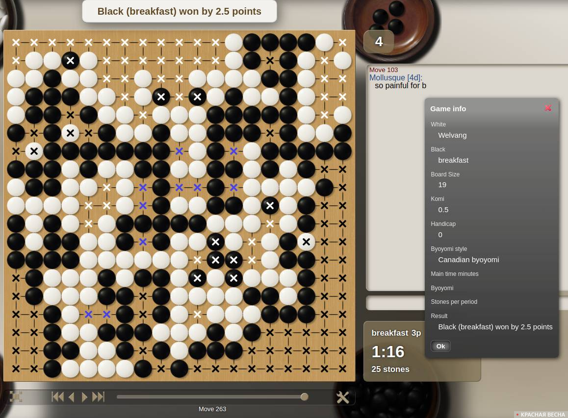 Француз Лё Кальв победил Динерштейна с небольшим перевесом в 3,5 очка. Сообщение сервера о выигрыше черных фактически оказалось ложным из-за неверно установленного коми.
