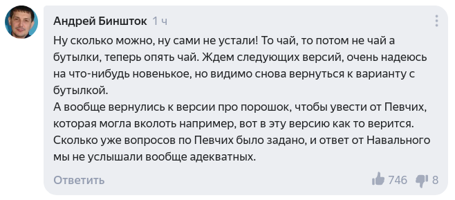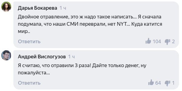 «Двойное отравление, это ж надо такое написать… Я сначала подумала, что наши СМИ переврали, нет NYT… Куда катится мир.», — написала Дарья Бокарева. «Я считаю, что отравили 3 раза! Дайте только денег, ну пожалуйста…», — ответил ей Андрей Вислогузов.