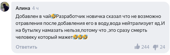 «Добавлен в чай🤣Разработчик новичка сказал что не возможно отравления после добавления его в воду, вода нейтрализует яд.И на бутылку намазать нельзя, потому что, это сразу смерть человеку который мажет🤣🤣🤣», — заявила Алина (авторские орфография, пунктуация и эмотиконы сохранены).