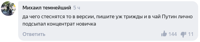 «Да чего стеснятся то в версии, пишите уж трижды и в чай Путин лично подсыпал концентрат новичка», — сказал Михаил темнейший.