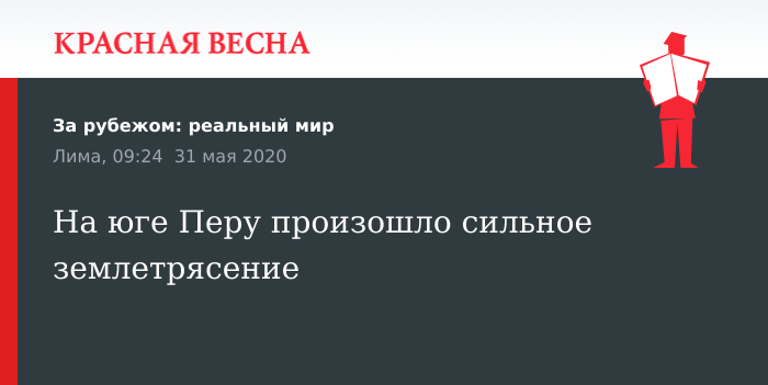 Землетрясение магнитудой 6 баллов по шкале Рихтера произошло на юге Перу неподалеку от границ с Боливией и Чили. Об этом 31 мая сообщает Геологическая служба США.