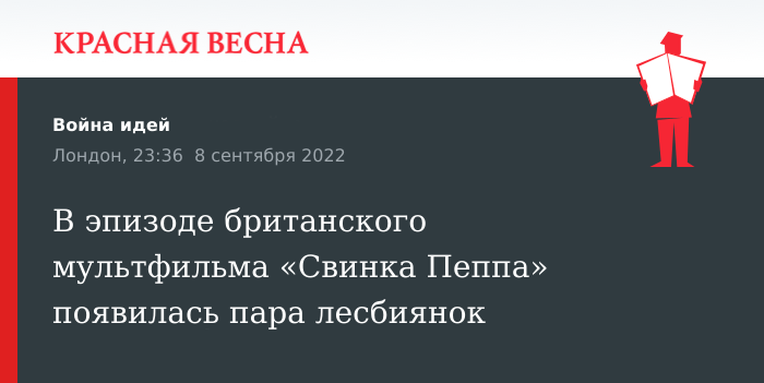 В британском мультфильме «Свинка Пеппа», популярном среди детей во всем мире, впервые в одном из эпизодов была представлена пара «матерей»-лесбиянок, что вызвало бурное одобрение ЛГБТ-сообщества, 8 сентября сообщает Le Figaro.