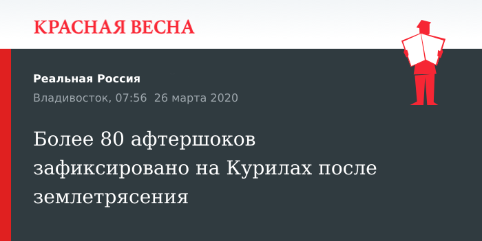 Свыше 80 повторных и меньших по силе толчков произошло после землетрясения магнитудой 7,6 у Северных Курил, сообщила начальник сейсмостанции Южно-Сахалинск Елена Семенова, 26 марта передают РИА Новости.