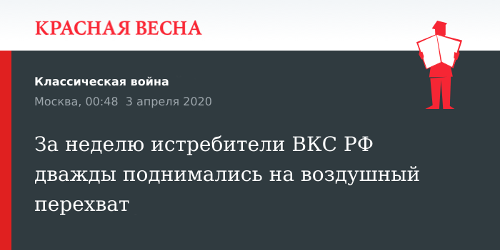 Дважды боевые вылеты, направленные на пресечение нарушения государственной границы России иностранными летательными аппаратами, совершали истребители российского ПВО, говорится в сообщении Министерства обороны, 3 апреля опубликованном в издании «Красная звезда».