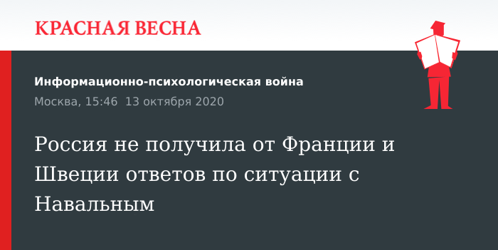 Россия не может провести полноценного расследования так называемого «отравления» блогера Алексея Навального из-за нежелания Франции и Швеции дать ответы на направленные в их адрес запросы, заявили в МИД РФ 13 октября, сообщает пресс-служба ведомства.