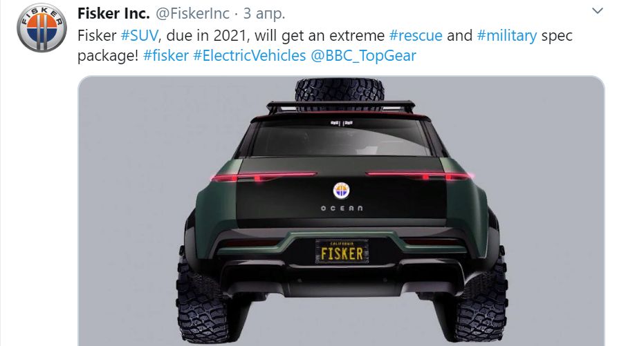 Изображение внедорожной версии своего будущего электрического кроссовера Ocean опубликовала компания Fisker, 3 апреля на своей странице в Twitter.