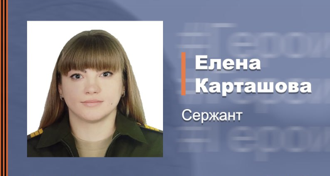 Согласно сообщению, операционная медицинская сестра сержант Елена Карташова с первых дней спецоперации самоотверженно и на высоком профессиональном уровне оказывала медицинскую помощь раненым бойцам и командирам российских Вооруженных сил, организовывала эвакуацию тяжелораненых военнослужащих и мирных жителей санитарными вертолетами и автотранспортом. С ее помощью было проведено 147 хирургических операций.