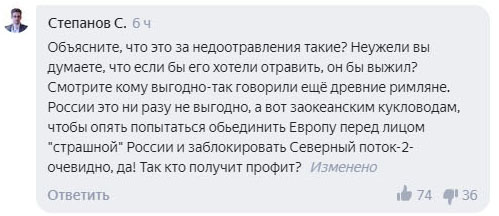 Так, пользователь Степанов С. высказал соображение, что «отравление» блогера менее всего выгодно России и наиболее выгодно западным политикам, заявляющим после события о санкциях в виде закрытия российского проекта «Северный поток — 2»:
