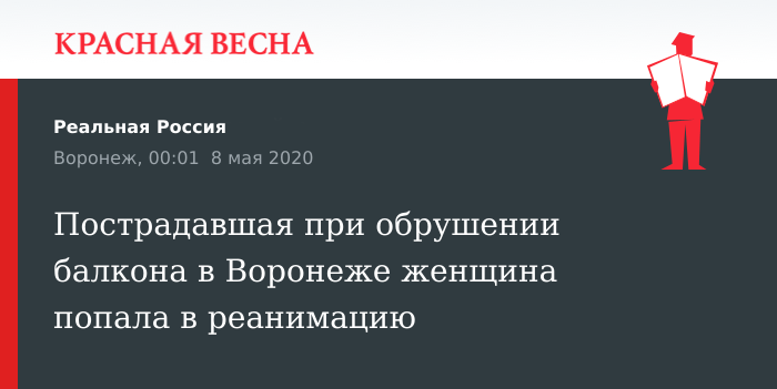 Женщина 49 лет, пострадавшая при обрушении балкона в Воронеже, оказалась в реанимации, 7 мая сообщает пресс-служба прокуратуры Воронежа.