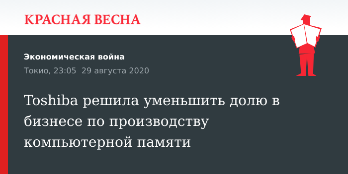Уменьшение своей доли в производителе компьютерной памяти Kioxia запланировала бывшая головная компания подразделения — японская Toshiba, сообщил 28 августа Nikkei.