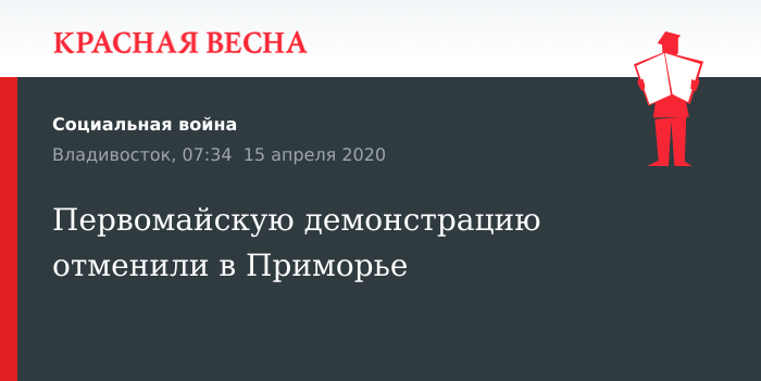 Отменена первомайская демонстрация в Приморском крае из-за распространения коронавирусной инфекции, 15 апреля сообщила пресс-служба правительства региона.