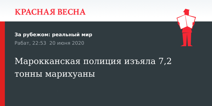 7,2 тонны марихуаны конфискованы в результате двух операций полиции Марокко 18 июня, сообщает 20 июня китайское ИА Синьхуа со ссылкой на Генеральное управление национальной безопасности королевства.