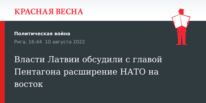 Перспективы развития военного сотрудничества между Вашингтоном и Ригой обсудил министр обороны США Ллойд Остин с президентом Латвии Эгилсом Левитсом, премьер-министром Кришьянисом Кариньшом и главой минобороны Артисом Пабриксом, 10 августа говорится в заявлении Пентагона.