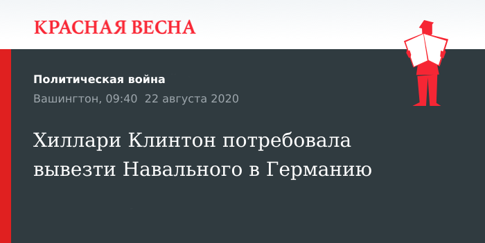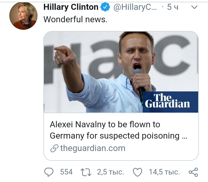 «Я вместе с Юлией Навальной, женой лидера российской оппозиции Алексея Навального, и членами международного сообщества срочно требую его перевозки в Германию для лечения, которое могло бы спасти его жизнь», — заявила Хиллари Клинтон. Также в ее аккаунте следующим постом идет ссылка на новость в издании Guardian о том, что Навального вывезли в Германию.