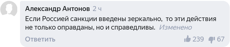 Стоит отметить, что некоторые пользователи выражали неодобрение по поводу ответа российских властей на западные санкции, число неодобрительных оценок под такими комментариями значительно превосходило число «лайков».