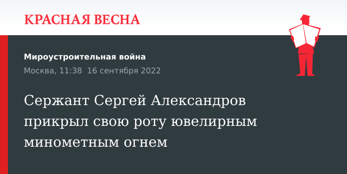 Мужество и высочайшее мастерство командира минометного расчета сержанта Сергея Александрова, уничтожившего в бою большое количество военной техники и живой силы неонацистов, позволили сорвать их наступление в ходе выполнения спецоперации по освобождению Донбасса и денацификации Украины. Об этом 16 сентября сообщила пресс-служба Минобороны РФ.