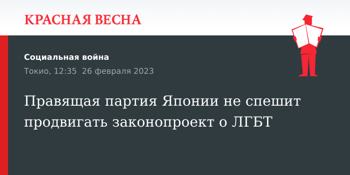 Обсуждение предлагаемого закона, призванного способствовать «пониманию» ЛГБТ, в ближайшее время не намерено проводить руководство правящей Либерально-демократической партии Японии (ЛДП), 26 февраля сообщает The Jiji Press.