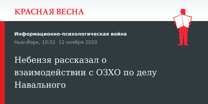 Продолжается согласование условий визита миссии Организации по запрещению химического оружия (ОЗХО) в Россию в связи с инцидентом, произошедшим с блогером Алексеем Навальным. Об этом в опубликованном 12 ноября интервью РИА Новости заявил постпред РA при ООН Василий Небензя.