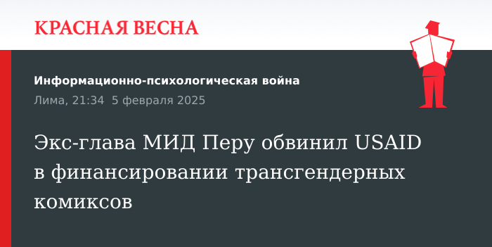 Часть денег агентства США по международному развитию (USAID) была использована для финансирования комиксов о трансгендерах, предназначенных для детей Перу, заявил бывший министр иностранных дел Луис Гонсалес. Об этом 4 февраля сообщает журнал Exitosa Noticias. __