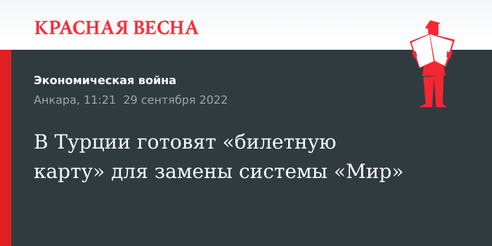 «Билетную карту» в качестве альтернативы платежной системе «Мир» для российских туристов разрабатывают туристические организации Турции, 29 сентября пишет газета Sabah со ссылкой на источники.