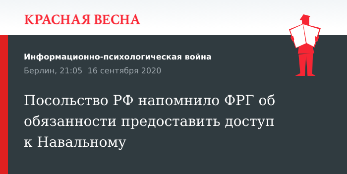 Правительство Германии обязано предоставить России консульский доступ к блогеру Алексею Навальному, соответствующую ноту посольство РФ в Берлине направило в МИД ФРГ, 16 сентября сообщает «Коммерсант».