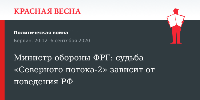 Вынесение на повестку дня обсуждения «Северного потока-2» из-за инцидента с блогером Алексеем Навальным не исключила председатель Христианско-демократического союза (ХДС) и министр обороны Германии Аннегрет Крамп-Карренбауэр, 6 сентября она рассказала об этом агентству Reuters.