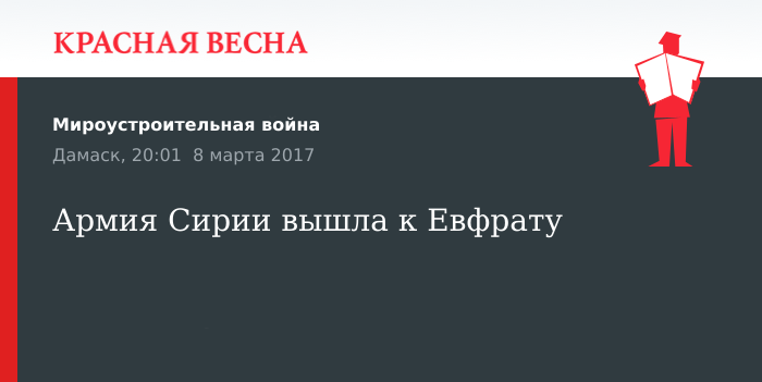 Сообщается, что в ходе наступления к Евфрату правительственные войска овладели высотой Джебель-эс-Сульме и очистили от террористов ИГ (организация, деятельность которой запрещена в РФ) населенные пункты Аруда-Кебир, Хафса-Сегир и Сахни. В настоящий момент элитным подразделением «Тигры» занята водоочистная станция в Эль-Хафсе, которая снабжала водой Алеппо до ее разрушения боевиками в декабре.