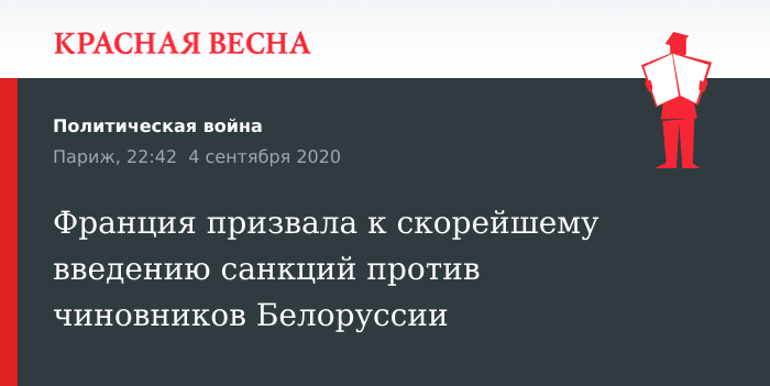 Соответствующий комментарий в министерстве дали после публикации в немецкой газете Die Welt, где утверждалось, что Франция выступает против введения санкций в отношении Лукашенко. В МИДе напомнили, что в ЕС уже приняли решение о введении санкций против чиновников, причастных к якобы имеющимся махинациям на президентских выборах в Белоруссии.