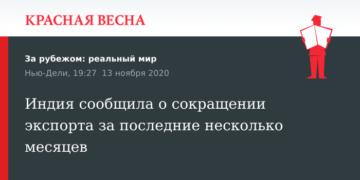 На 14,53% сократился общий объем экспорта Индии за период с апреля по октябрь 2020 года по сравнению с аналогичным периодом 2019 года, 13 ноября сообщает Синьхуа.