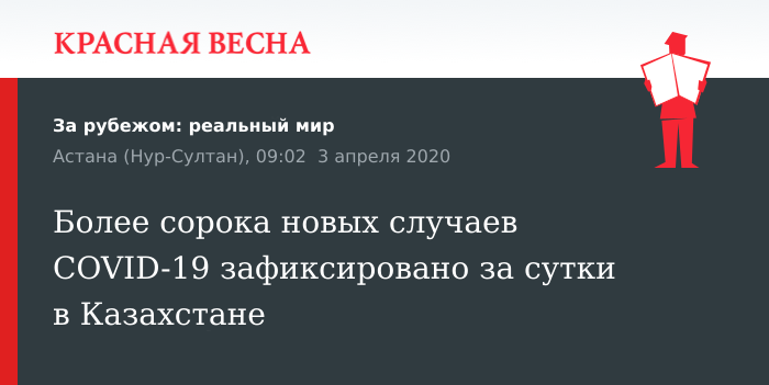 По данным ресурса, на 12:00 (09:00 мск) 3 апреля число инфицированных в Казахстане составило 448 человек. За сутки выздоровело два человека, всего из лечебных учреждений выписаны 28 пациентов. Всего в республике зарегистрировано три летальных случая.