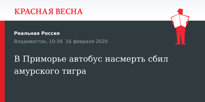 Смертельные раны получил амурский тигр в результате столкновения с автобусом в Приморье рядом с селом Гоголевка, 16 февраля сообщает ТАСС со ссылкой на директора центра «Амурский тигр» Сергея Арамилева.