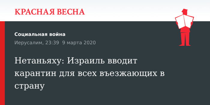 На карантин сроком 14 дней будут помещать всех, прибывших в Израиль граждан, заявил премьер-министр Биньямин Нетаньяху 9 марта в своем видеообращении, сообщает Jerusalem Post.