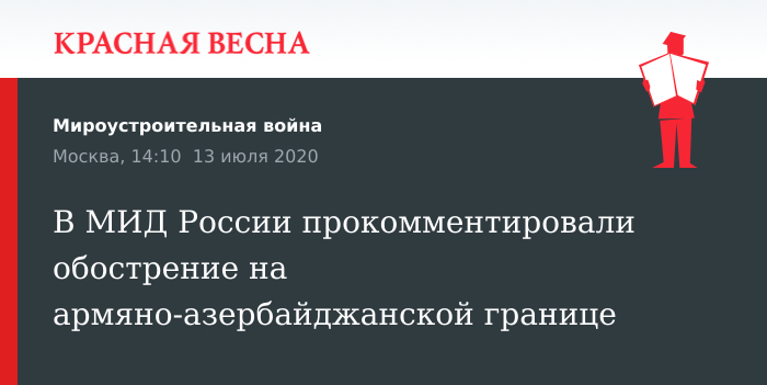 Российский МИД выразил озабоченность обострением на границе Армении и Азербайджана и назвал дальнейшую эскалацию конфликта недопустимой. Соответствующее заявление опубликовано 13 июля на официальной странице российского внешнеполитического ведомства в Twitter.