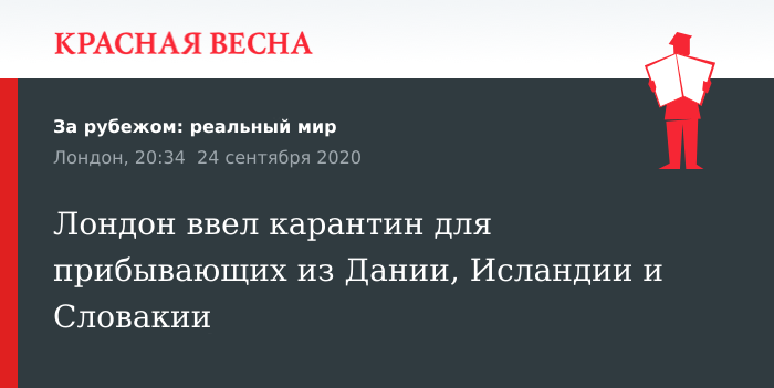 Двухнедельный карантин для граждан, прибывающих в Великобританию из Дании, Исландии и Словакии, ввели британские власти. Об этом 24 сентября в совместном коммюнике сообщили пресс-службы МИД и Минтранспорта Великобритании.