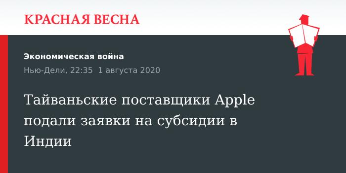 Заявки на участие в индийской программе стимулирования производства в стране мобильных телефонов объемом 6,65 млрд долларов обратились поставщики Apple — тайваньские компании Foxconn, Wistron и Pegatron, сообщил министр технологий Индии Шанкар Прасад 1 августа на пресс-конференции в присутствии журналистов.