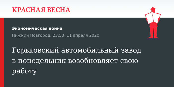 Работу основных производств, приостановленную в конце марта в связи с пандемией коронавирусной инфекции COVID-19, в понедельник 13 апреля возобновляет Горьковский автомобильный завод «ГАЗ», 11 апреля сообщает Интерфакс.