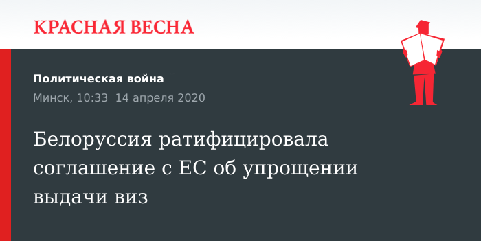 Соглашения с Евросоюзом о реадмиссии и упрощении выдачи виз ратифицировала Белоруссия. Соответствующие законы были опубликованы 14 апреля на Национальном правовом интернет-портале Белоруссии.